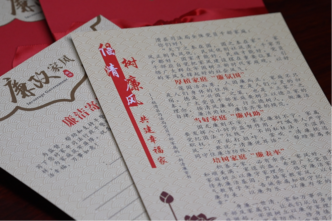 活动中,县司法局在向全体党员干部家属送去中秋问候之际,同时奉上一封清廉家书,提出厚植家庭“廉氛围”,当好家庭“廉内助”,培树家庭“廉表率”的倡议,引导广大党员干部家庭自觉将家风建设摆在重要位置,严格家风家教,同谱清廉乐章,鼓励广大党员干部家属发挥“八小时”外监督作用,常吹“清廉枕边风”,敢说“清廉逆耳话”。
