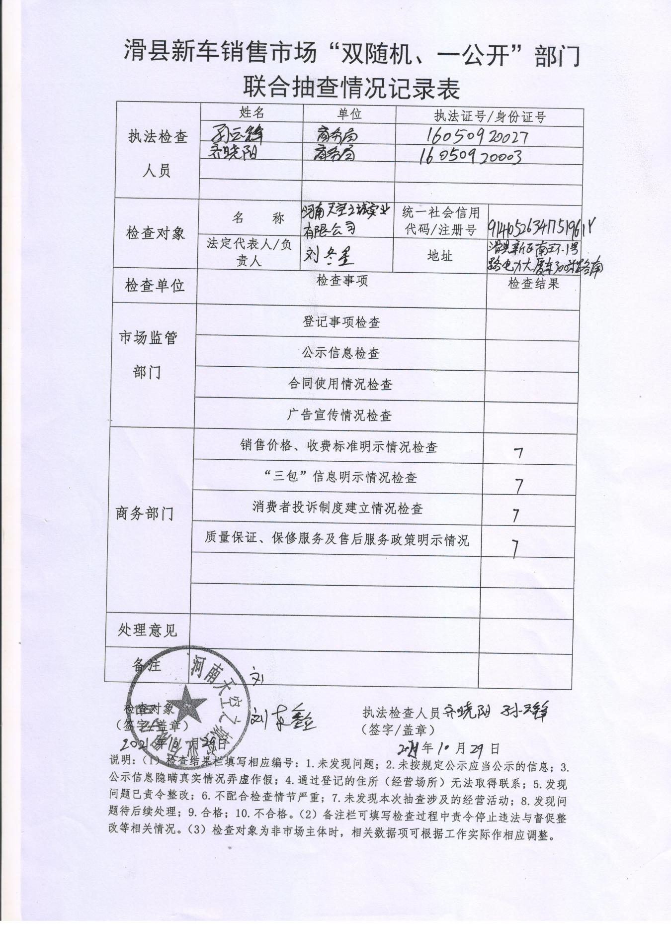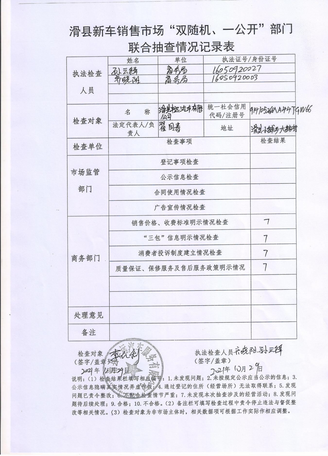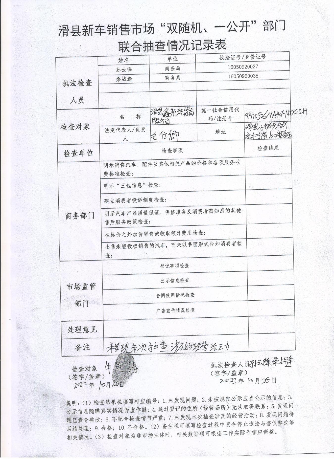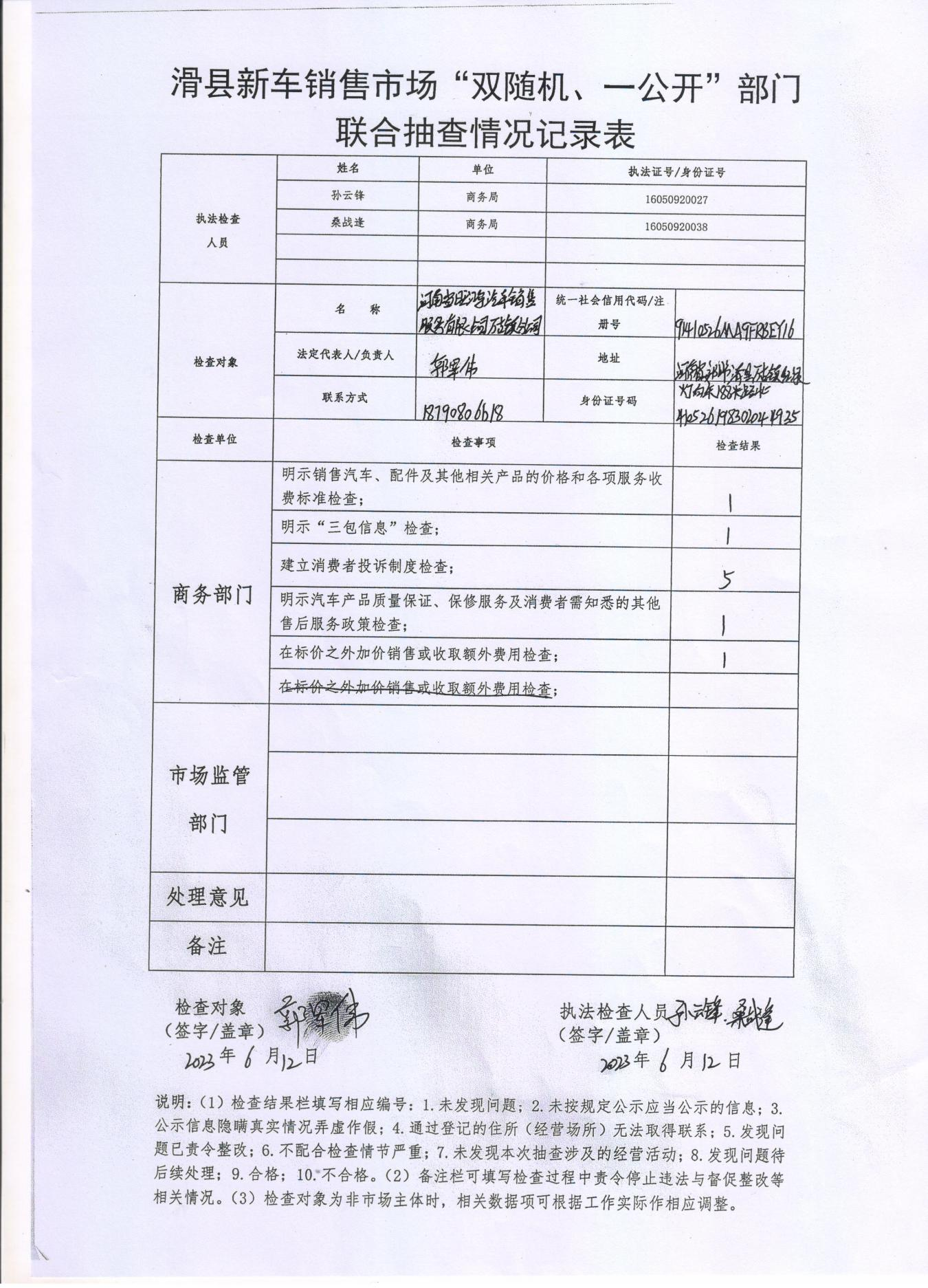 滑县新车销售市场“双随机、一公开”部门联合抽查情况记录表