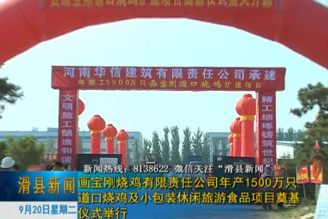 9月20日上午,年产1500万只道口烧鸡及小包装休闲旅游食品项目奠基仪式举行,安阳市委常委、县委书记董良鸿,县领导陈忠、李向前、王国民、陈俊江、袁锐锋、侯德安、徐永战、张红琳、陈卫东、郑进武、赵继芳参加奠基仪式。