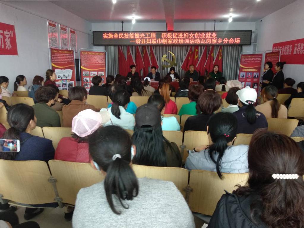 为全面贯彻党的十九大精神,实施全民技能振兴工程积极促进妇女创业就业,帮助贫困妇女提高认识、转变思想,学到一技之长,依靠自己的辛勤劳动走上脱贫致富路。2019年4月18日,瓦岗寨乡在乡政府五楼会议室组织开展了巾帼家政扶贫活动,来着全乡29个行政村55名妇女群众参加,此次活动由县妇联牵头,精心设计了“月嫂、育婴师、家政保洁”等培训课程,委托鑫桥专业培训机构高级讲师全程授课。