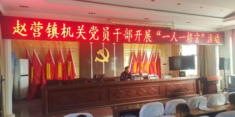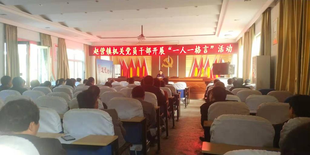 为进一步推进“不忘初心、牢记使命”主题教育,激励党员干部积极工作、奋发有为,做到自重、自醒、自警、自励,11月1日,赵营镇开展机关党员干部“一人一格言”活动,全体机关党员干部参加会议。