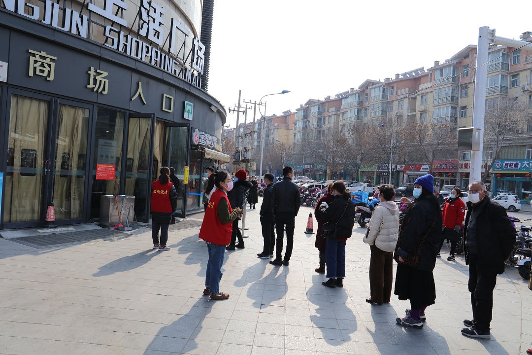 抗击疫情,文明先行。机关人员、社区工作者及大学生组成的志愿者队伍来到圣君超市门口,对前去购物的顾客,规范排队秩序,要求大家保持安全距离,配合测量体温、消杀、登记等相关工作。