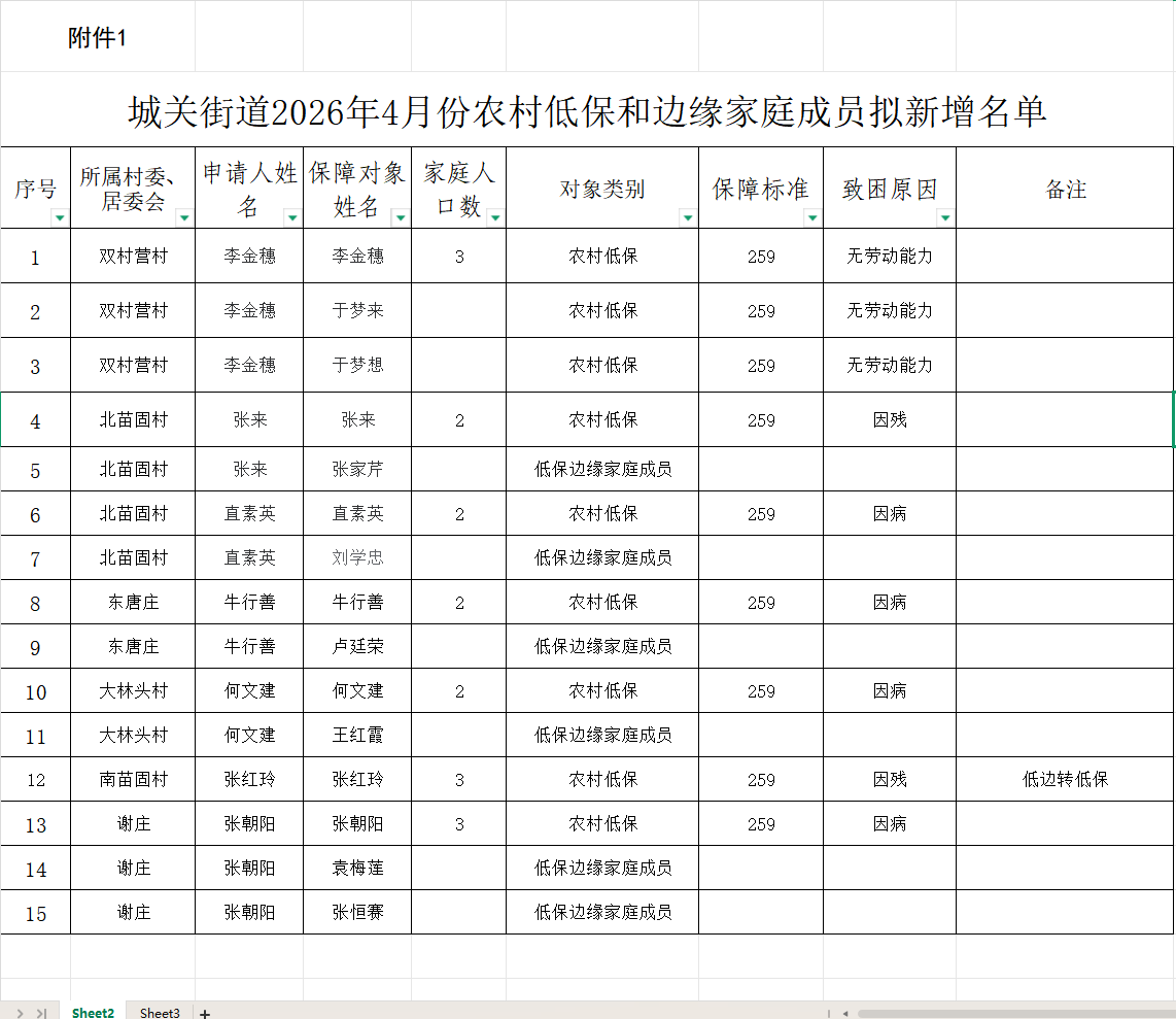 经个人申请、经济状况核对、城关街道入户调查、审核,现将城关街道2026年4月份拟新增农村低保、低保边缘家庭成员、城市低保及特困供养审核等有关情况予以公示,接受社会监督。如有异议,请尽可能提供事实依据,可直接向城关街道办事处反映。