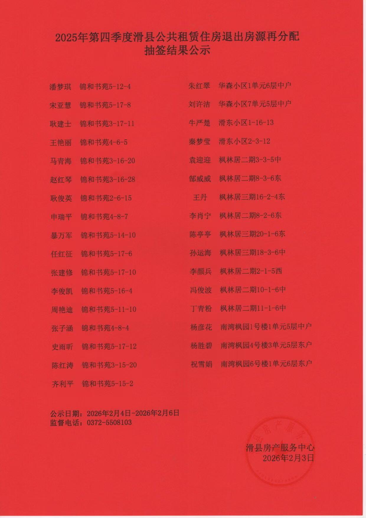 2025年第四季度滑县公共租赁住房退出房源再分配抽签结果公示