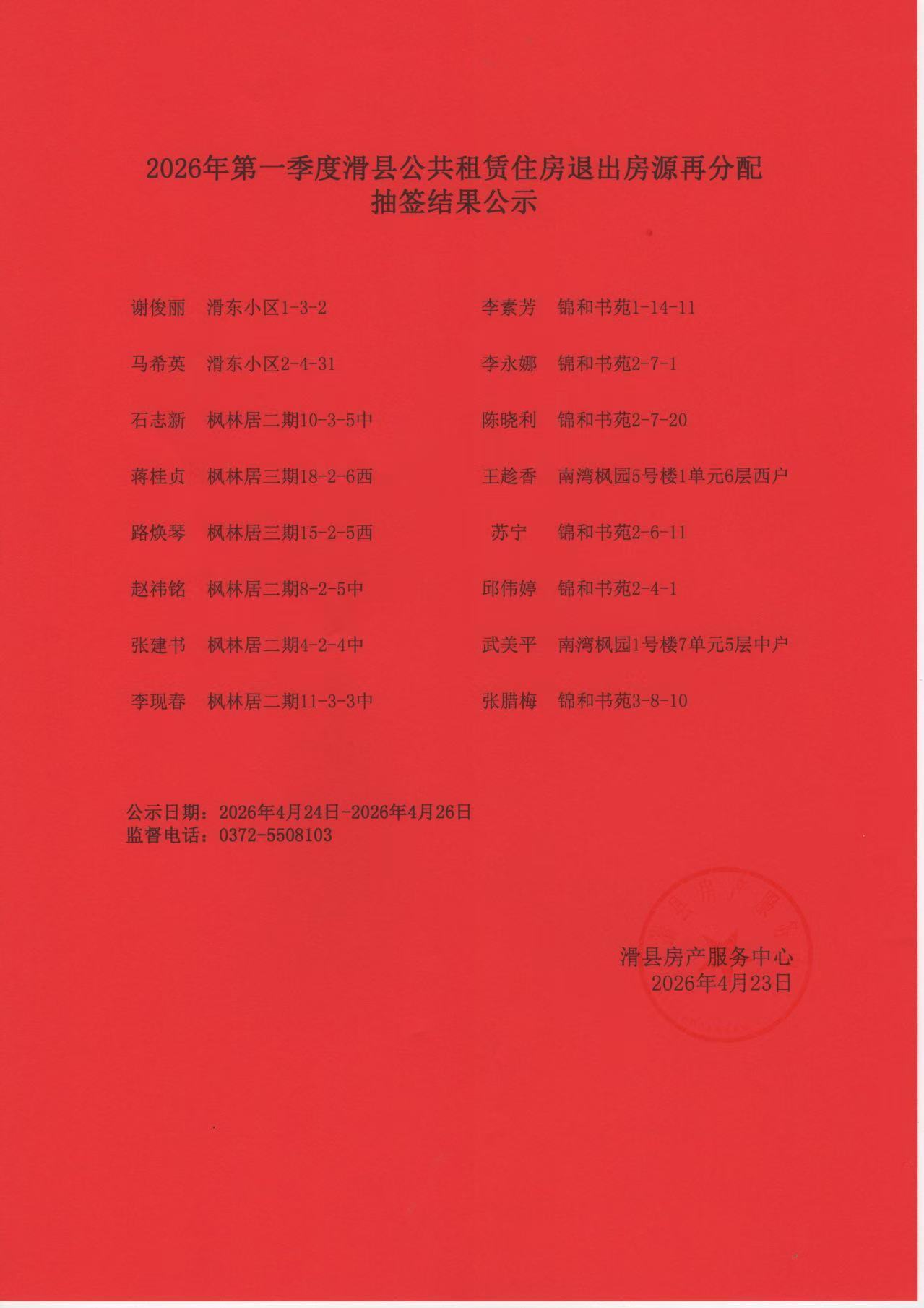 2026年第一季度滑县公共租赁住房退出房源再分配抽签结果公示