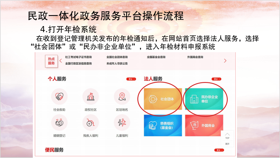 (一)网上填报。各社会组织对照年度检查标准(见附件1、附件2)进行自查,登录民政一体化政务服务平台(https://zwfw.mca.gov.cn/),输入社会组织账号密码登录,访问“法人服务”的“年检年报”---“在线办理”,即可登入社会组织年检(年报)系统填写《年度报告书》,其中,工作总结应包括遵守法律法规和有关政策情况;履行有关登记手续情况;党政领导干部在社会组织兼职情况;党组织建设及开展党的活动情况;依章程换届及开展活动情况;人员和机构变动情况;分支(代表)机构设立情况;财务管理情况;开展乡村振兴、助力基层治理等公益活动情况;接受监督情况,确保内容真实、准确、完整后点击“提交”按钮。未实名注册法人账号的社会组织需先注册法人账号,再进入“年检年报”系统填写《年度报告书》(见附件3)。6月1日起网上填报通道将关闭。