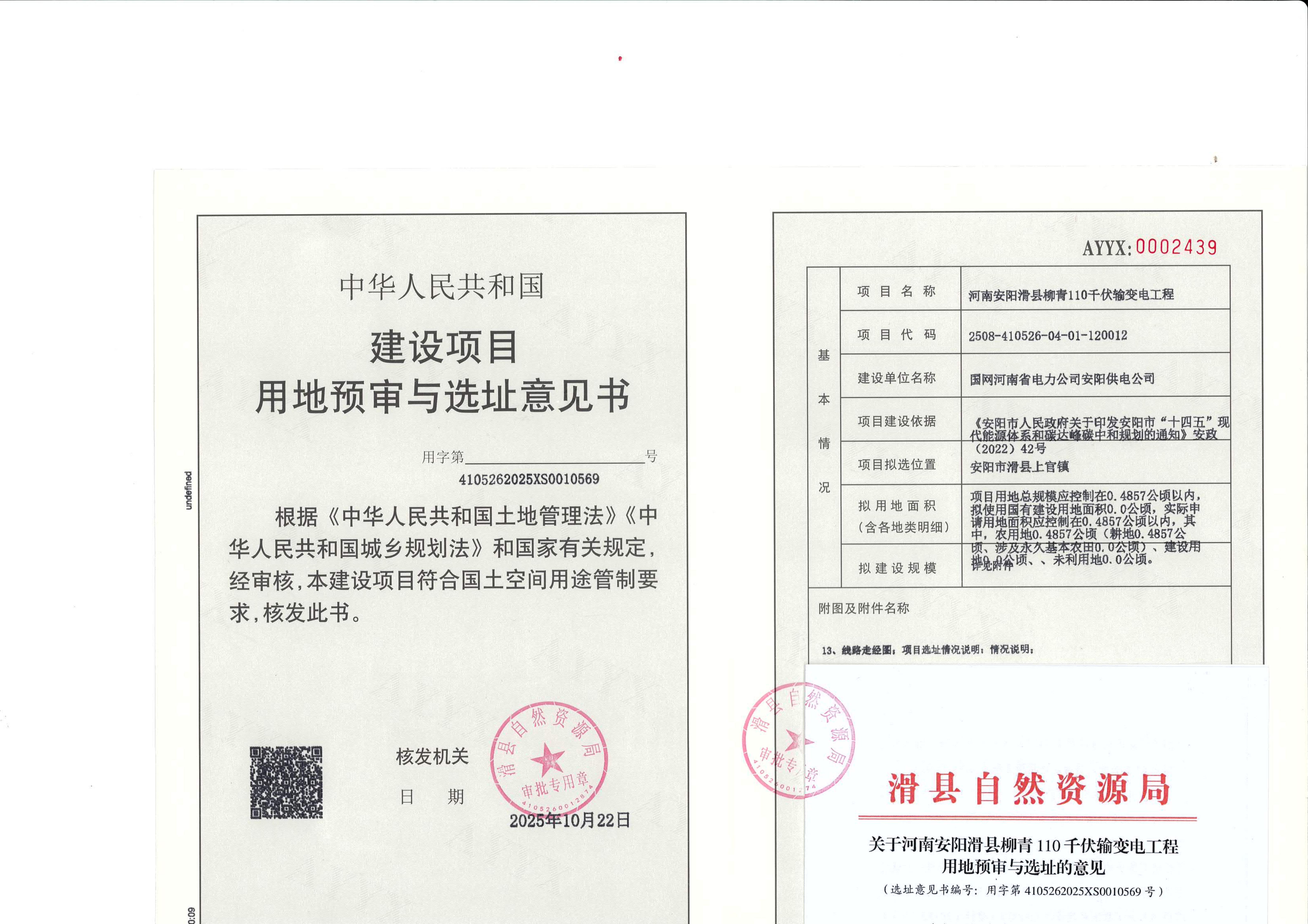 河南安阳滑县柳青110千伏物变电工程用地预审与选址意见书