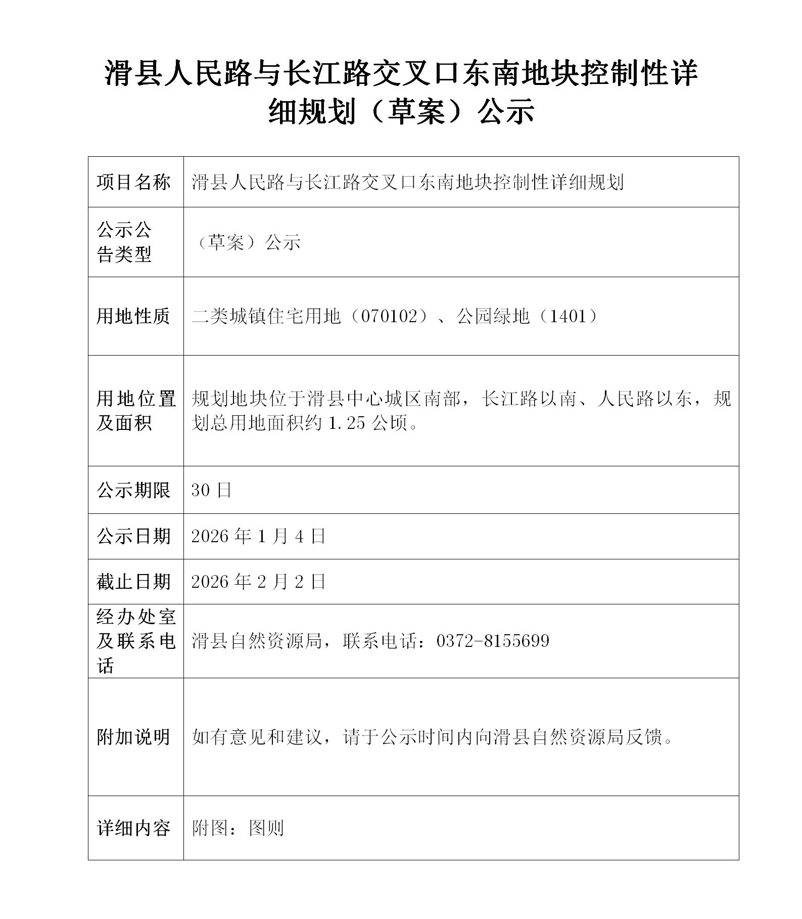 滑县人民路与长江路交叉口东南地块控制性详细规划(草案)公示