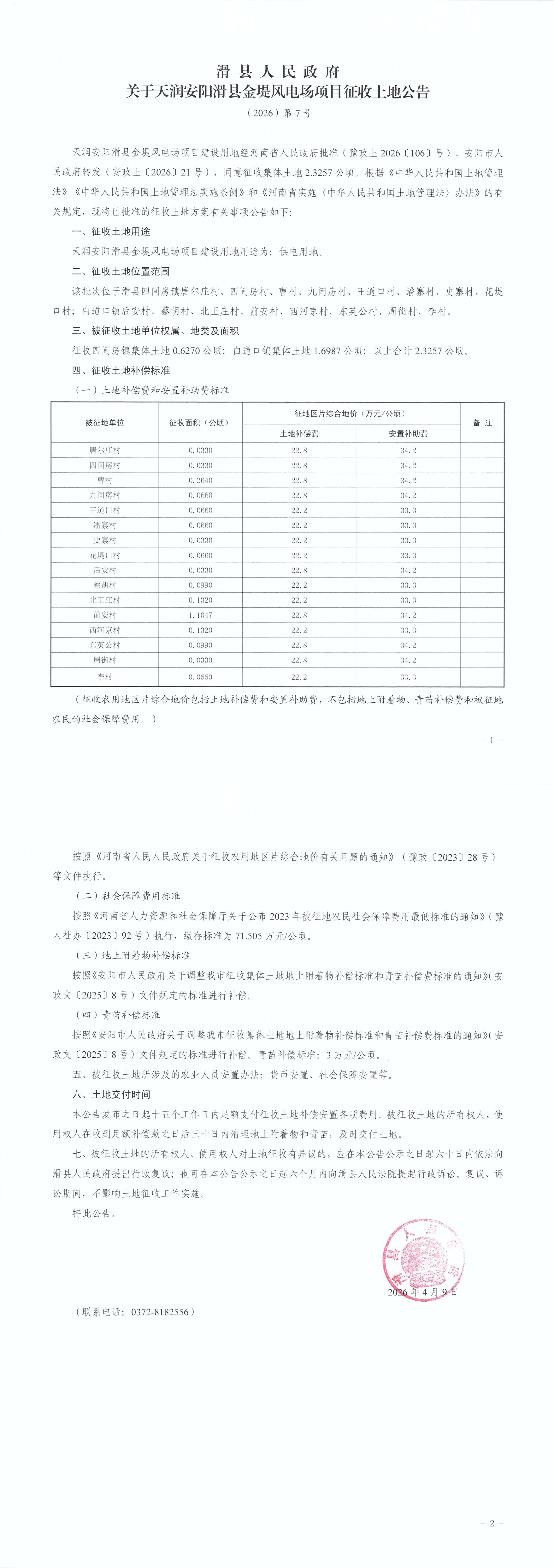 滑县人民政府关于天润安阳滑县金堤风电场项目征收土地公告(2026)第7号