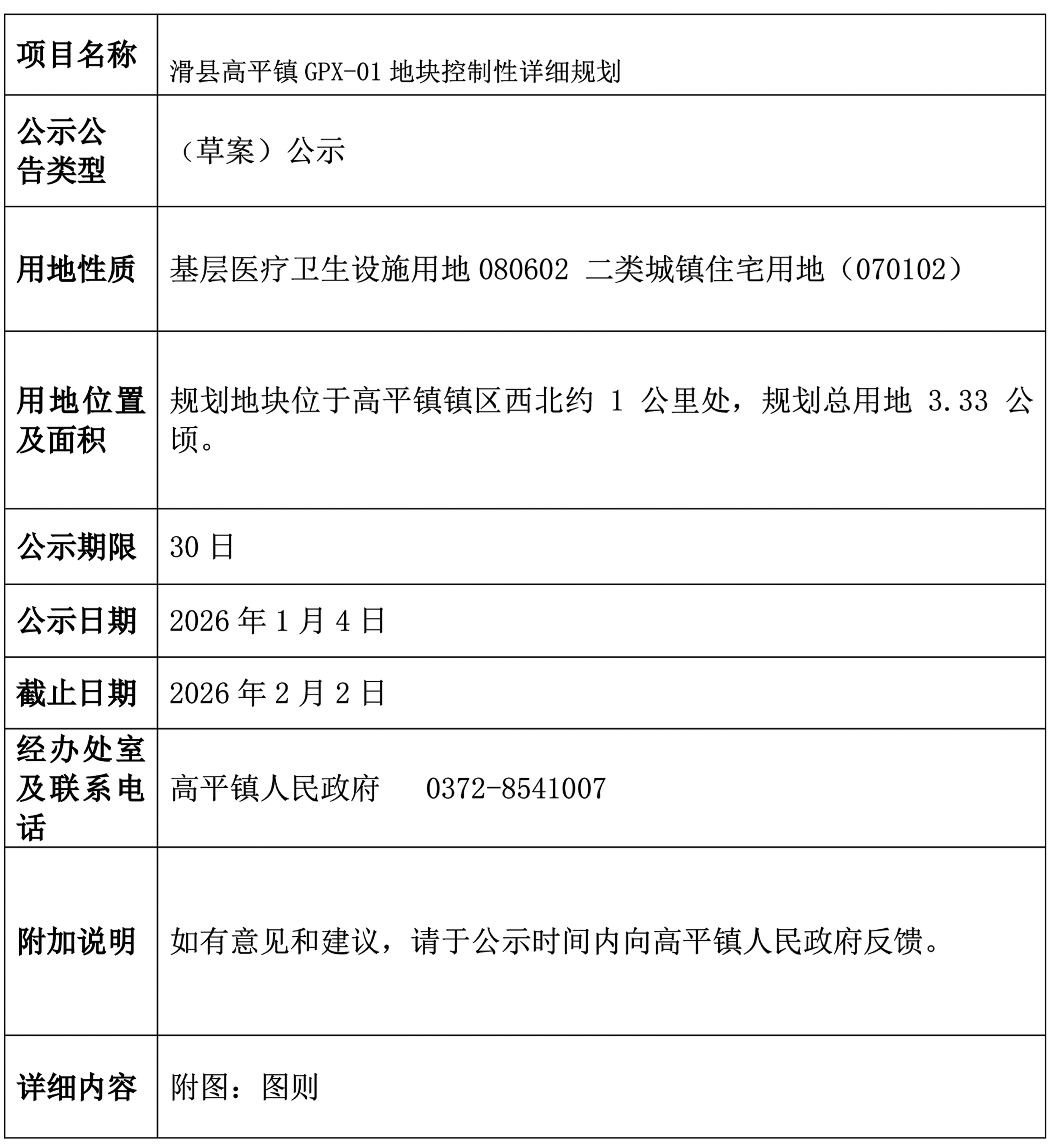 滑县高平镇GPX-01地块控制性详细规划(草案)公示